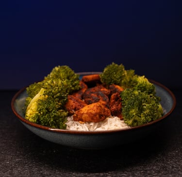 Luchtige basmati rijst met gemarineerde malse kip en felgroene gestoomde broccoli.