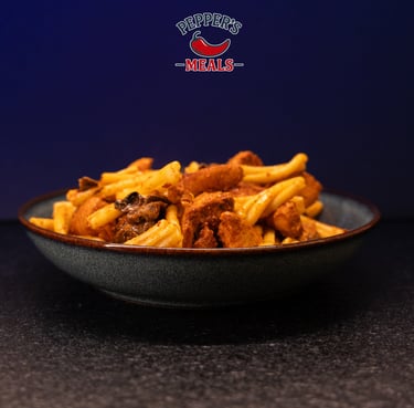Romige pasta met gemarineerde malse kip, parmezaanse kaas en heerlijke champignons.
