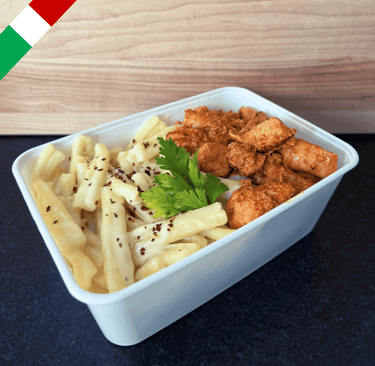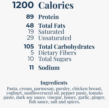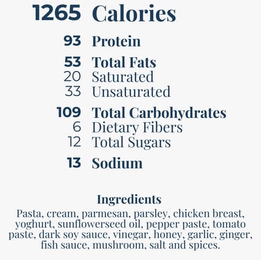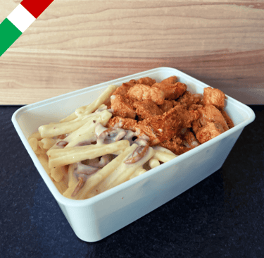 Creamy and cheesy pasta with tender marinated chicken and delicious mushrooms.
