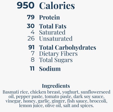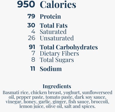 Fluffy basmati rice with tender marinated chicken and vibrant green steamed broccoli.
